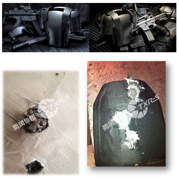 超高分子量聚乙烯纤维是国际公认性价比最高且可批量生产的防弹材料。该种纤维的分子量达到了800-1000万左右,是典型的超高长径比、超高伸长率、超高断裂功的特种纤维材料。同时也是典型的高吸能材料,非常适用于生产防弹衣的背板,亦适用于制造压力容器或吸能装置。高分子量聚乙烯纤维的密度只有0.8-0.9g/cm3,入水后可以悬浮,甚至还能当救生衣使用。4级防弹标准要求20cm×30cm规格板、重量在2.6kg以下,使用7.62×51mm口径、弹速800m/s的北约标准制式枪弹在10m内射击,防弹板不穿透并无侵彻力。这种制式的枪弹里威力最大的代表性枪支包括著名的AK47、美国的SCAR系列和我国的56式、81式步枪。腾风特材使用陶瓷与聚乙烯纤维制成的复合材料,使防弹板在能满足公安4级防弹标准的同时,减重性能达到全球同行业水平最高。同一规格的防弹板重量仅1.4kg。